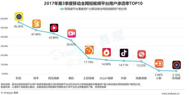 2017年第3季度移動全網(wǎng)短視頻平臺根據(jù)用戶滲透率分為三個梯隊(duì):