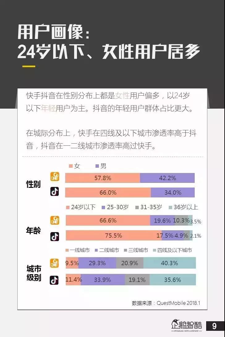 其實,無論是快手還是抖音,女性用戶的群體,都是要遠遠大于男性用戶的。年齡在24歲以下的年輕一代也占據(jù)60%~70%數(shù)量,這樣的優(yōu)勢可以說是巨大的。